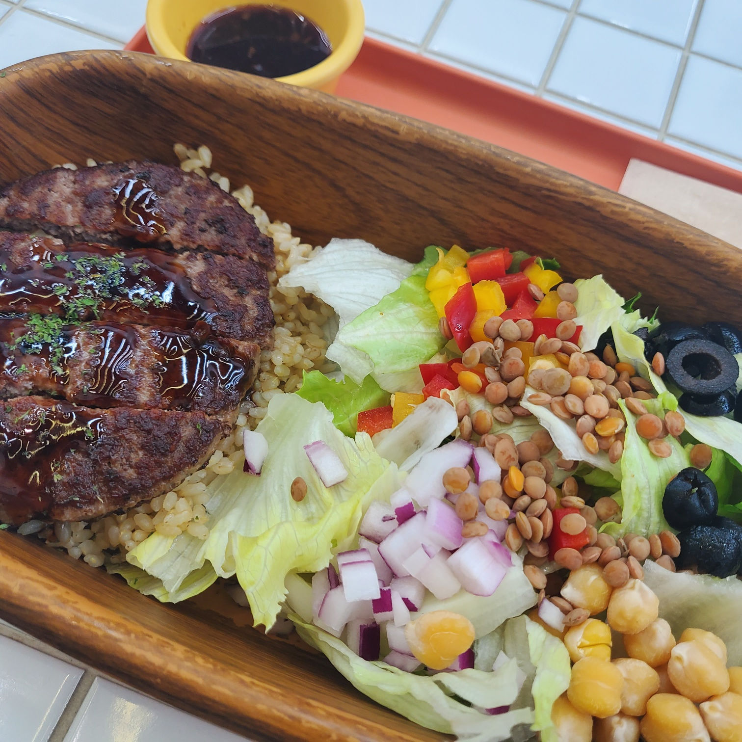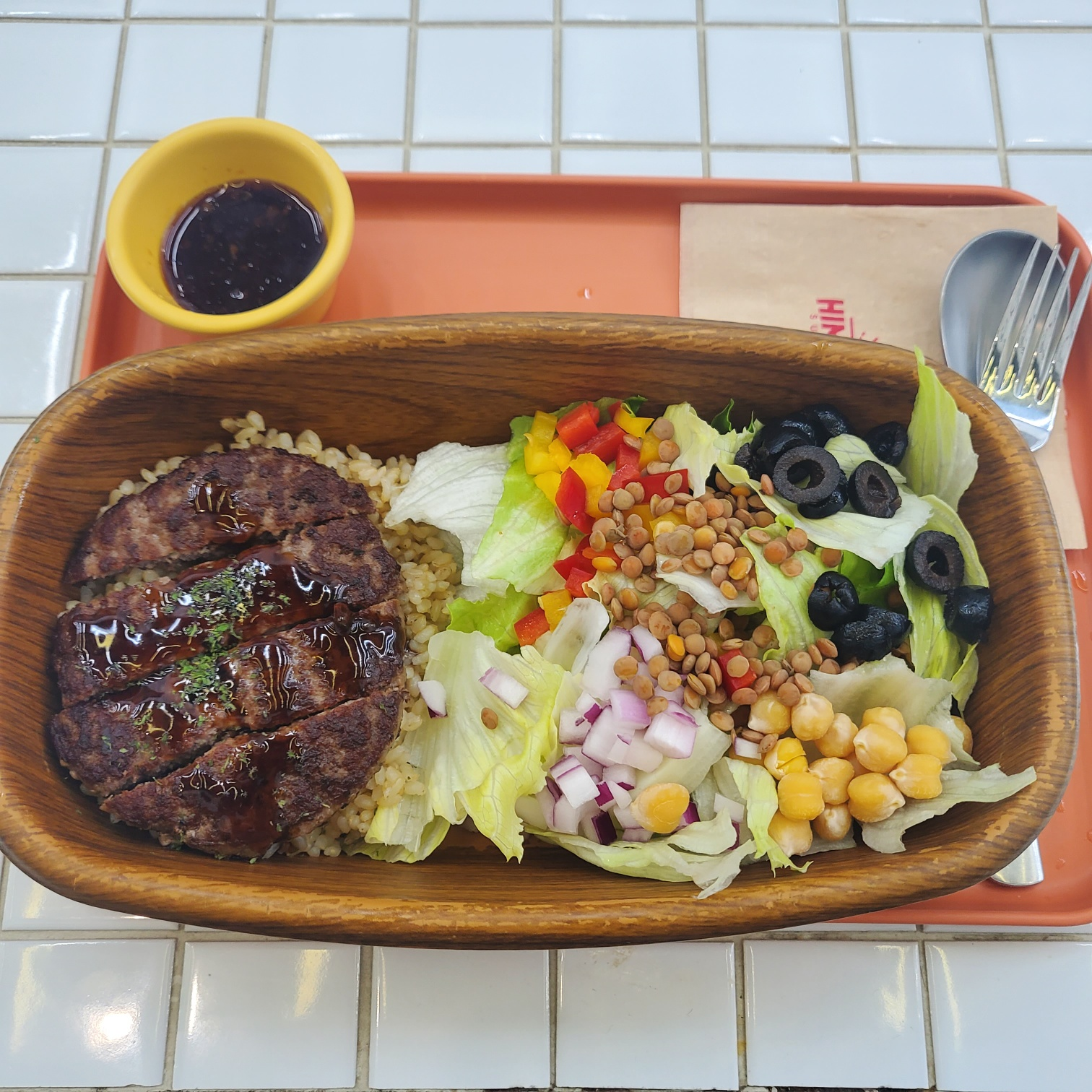 제가 주문한 힘백스테이크 보울입니다! 샐러드와 현미밥, 그리고 스테이크가 올라와 있어요.ㅎㅎ 소스는 오리엔탈 드레싱이 나옵니다. ㅎㅎ