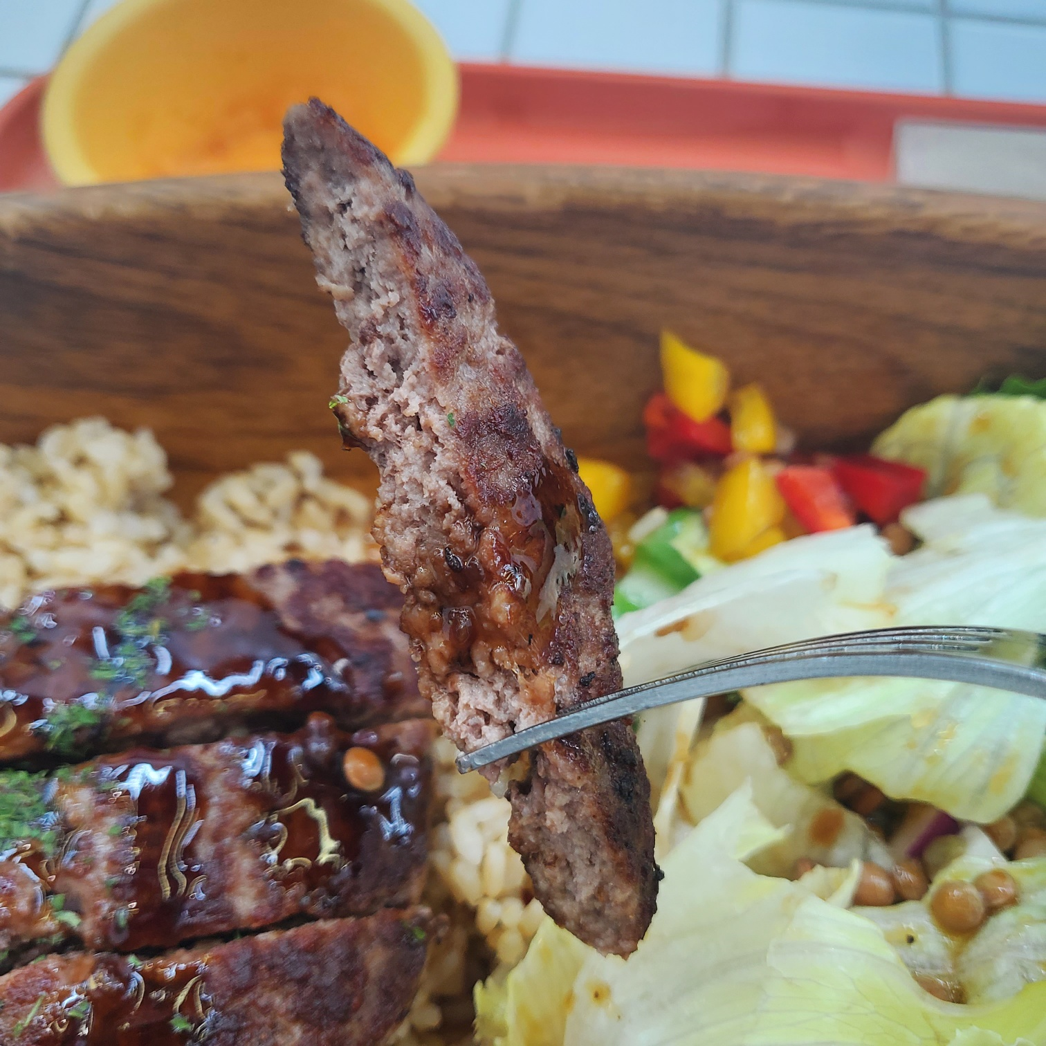 이 샐러드 보울의 메인이죠! 힘백스테이크입니다! 건강식답게 간은 슴슴하게 되어 있고, 스테이크 고기 본연의 맛을 느끼도록 자극적이거나 짜지 않게 먹을 수 있어 좋아요.ㅎㅎ