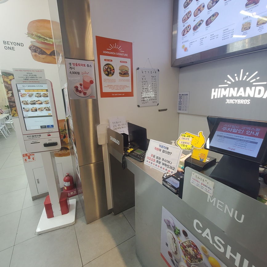 카운터는 비어 있는데, 키오스크를 이용하게 되어 있어요.ㅎㅎ 사장님이 안 계셔도 당황하지 말고 바로 키오스크로 가서 주문하면 됩니다. ㅎㅎ