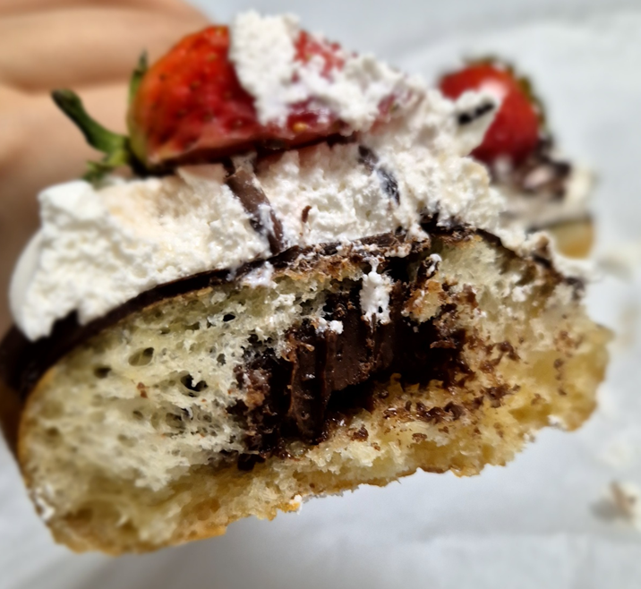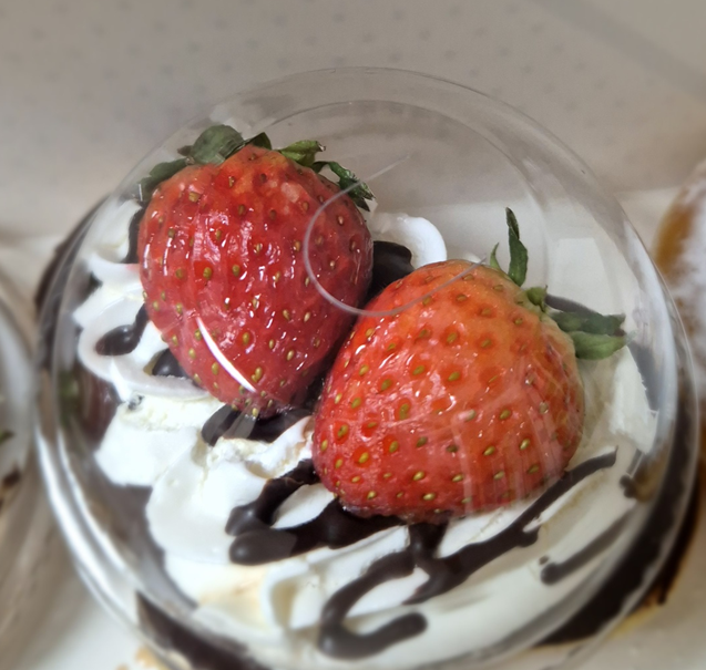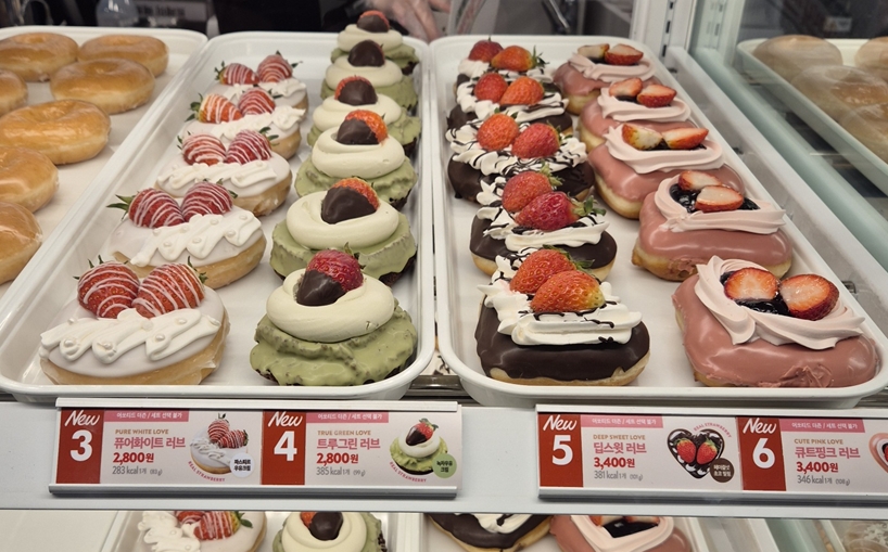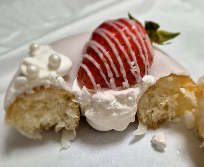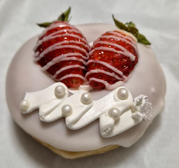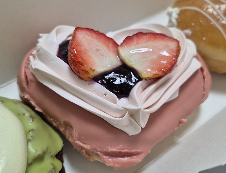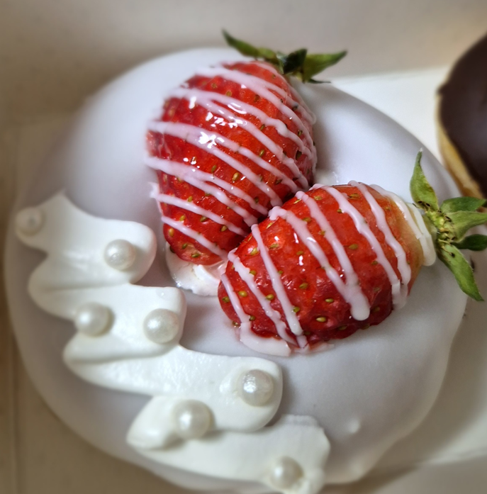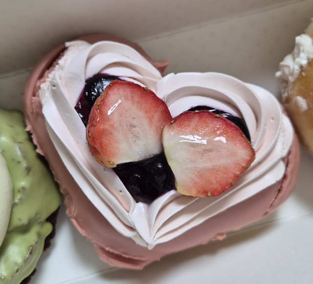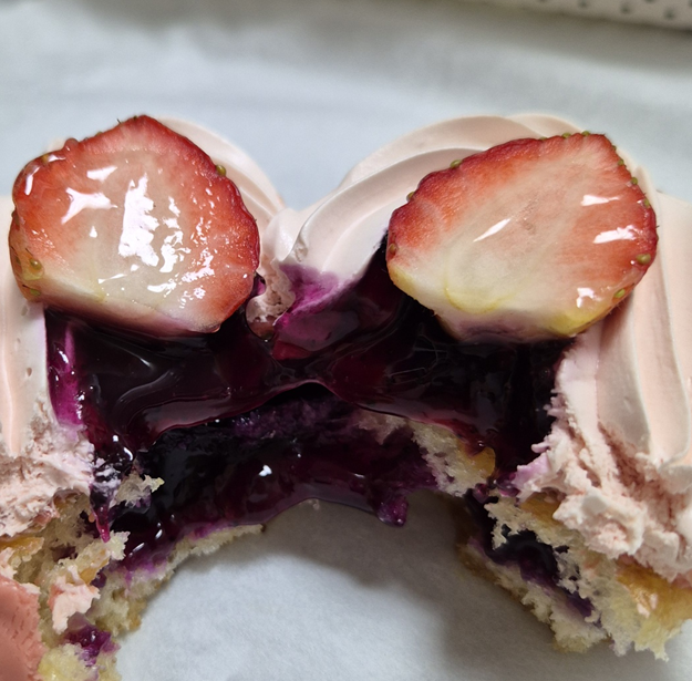 다른 도넛들과 달리 이 도넛은 통 딸기가 2개나 올라갑니다.ㅎㅎ 다른 도넛은 반쪽 씩 자른 딸기 하나이거나, 통딸기 하나인데 두 개를 올려주는 건 나름 이득이라 생각이 드네요.ㅎㅎㅎ