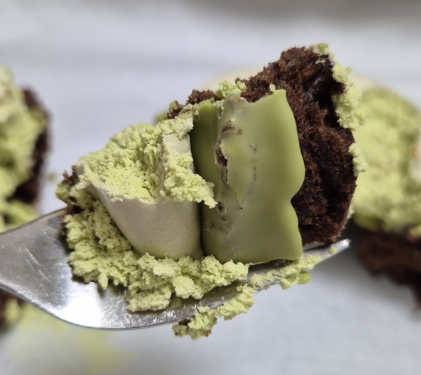 도넛은 글레이즈드 초코 케이크가 글레이즈 되지 않은 케이크 도넛입니다.ㅎㅎ 녹차 우유 크림과 녹차 초콜렛이 초코 케이크 도넛 위에 올라가 있어요.ㅎㅎ 녹차와 딸기의 조합이 궁금했습니다. ㅎㅎ
