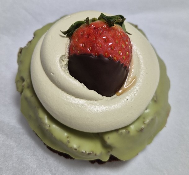 녹차가 베이스인 케이크 도넛이에요! 딸기 한 알이 통으로 올라가 있습니다. ㅎㅎ