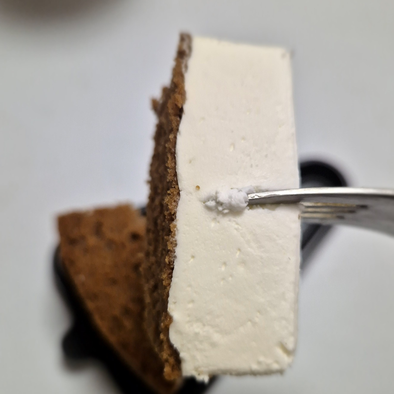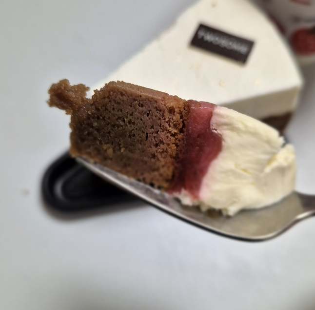 한 스푼 떠 보면 부드럽게 쑥 들어가는게 느껴져요.ㅎㅎ 밀가루가 없이 촉촉하게 만들어서 그런지 아몬드 구움 시트임에도 상당히 수분감이 많았어요. 촉촉이라기보다는 축축이 맞는 표현일 것 같습니다. ㅎㅎ 은은하게 초코향과 맛이 느껴져 밍밍한 맛을 커버해 줬습니다.ㅎ 시트는 아몬드 가루라서 그런지 살짝은 퍽퍽한 식감이었어요. 부드러운 케이크를 기대한다면 실망할 수 있는 식감이었습니다.