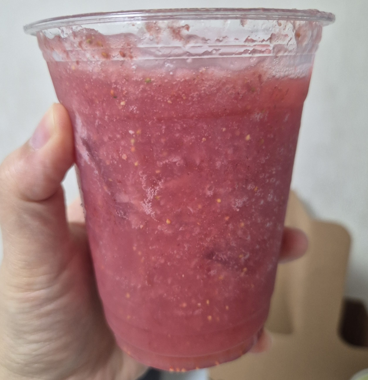딸기가 듬뿍 갈렸다는 게 느껴지는게 한입 마실 때마다 딸기 씨가 톡톡톡 끊임없이 터졌습니다. ㅎㅎ 묽기도 상당히 걸쭉했어요.ㅎㅎ 당분을 줄였다고 하지만 알룰로스와 스테비아로 단맛이 강합니다.ㅎㅎㅎ 저는 사실 알룰로스나 스테비아의 특유의 맛이 너무 강해서 조금 덜 들어갔으면 좋겠다고 느꼈는데 설탕을 멀리하시거나 줄이려고 하시는 분들은 충분히 좋아하실 음료인 것 같아요.ㅎㅎ