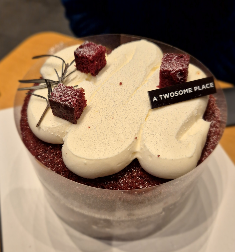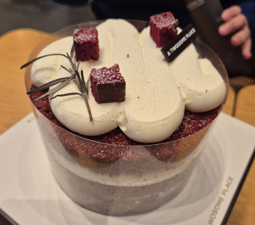 투썸만의 부드러운 크림 케이크를 생각하신다면 조금은 실망하실 수 있을 것 같습니다.ㅎㅎ 파운드 케이크보다는 부드럽지만 두툼한 레드 벨벳 시트이기 때문에 케이크가 조금은 뻑뻑하게 느껴지더라고요.ㅎㅎ 어릴 적 시골에서 먹었던 시골 옥수수빵의 느낌과 비슷했습니다.