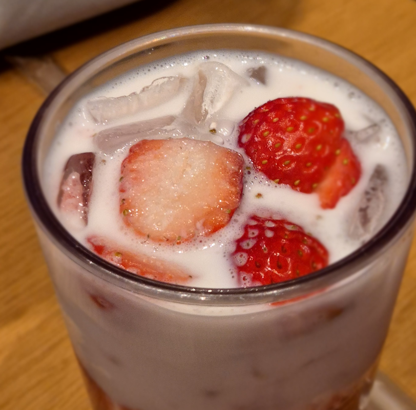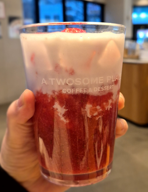 제철 맞은 딸기 라떼입니다. ㅎ 요거트 라떼와 반대로 제철 맞은 딸기 위에 우유가 올라가 있는 음료였습니다. ㅎㅎ