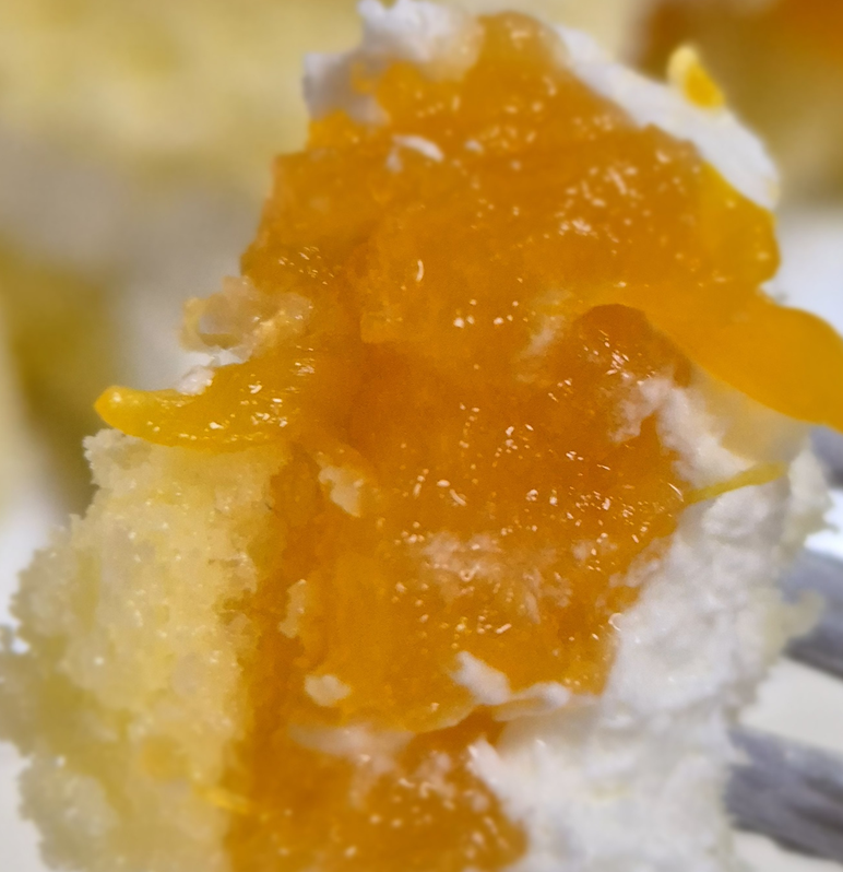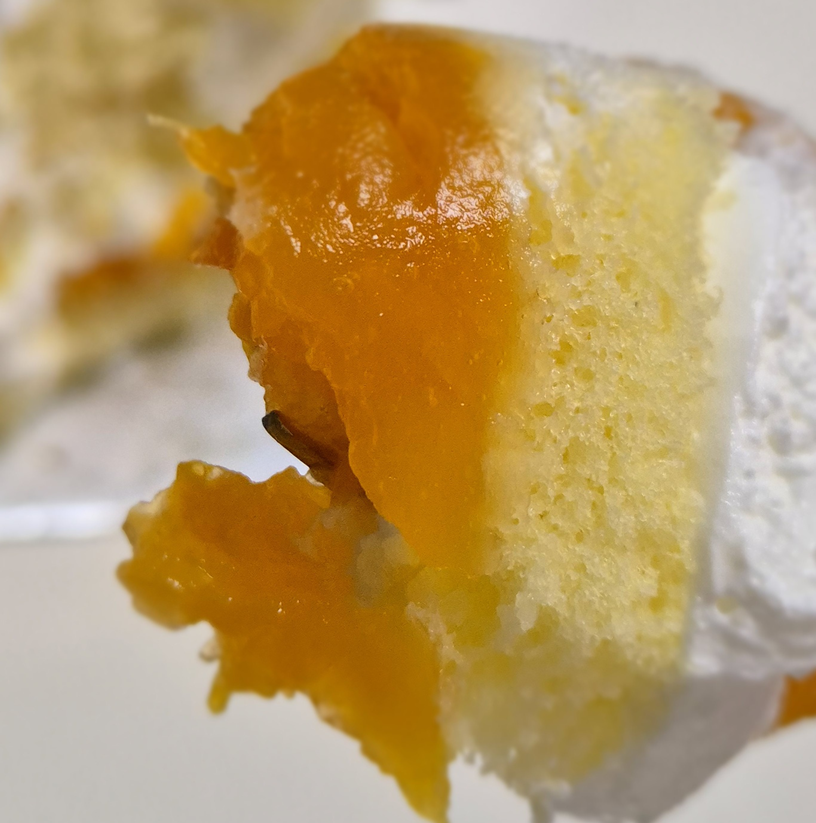 부드러운 케이크 시트 위로 금귤 콩포드가 올라가고, 그 위로 금귤 생크림과 케이크 시트가 샌드되어 가장 위에 감귤 토핑이 올라가 있는 상큼한 케이크입니다. 생딸기 우유 듬뿍 케이크보다는 조금 더 큰 사이즈였어요.