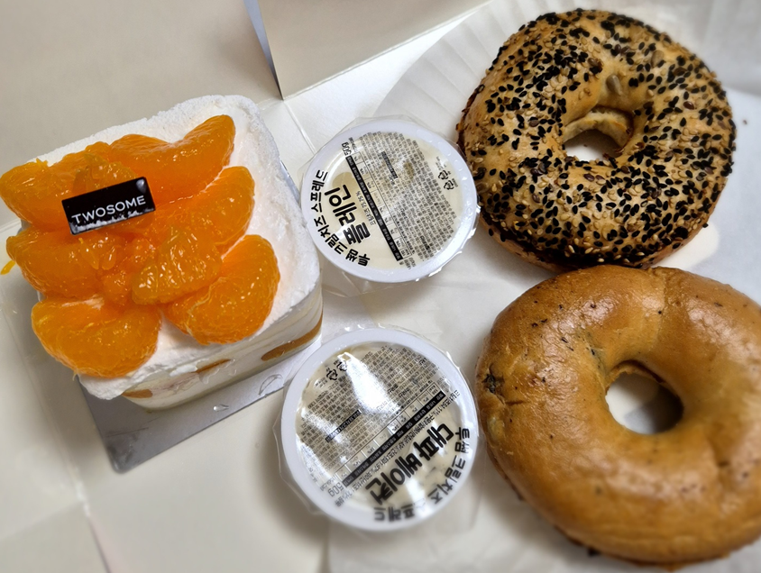 올리브 베이글이기 때문에 담백하게 먹고 싶어 플레인 크림치즈를 같이 발라 먹었습니다.