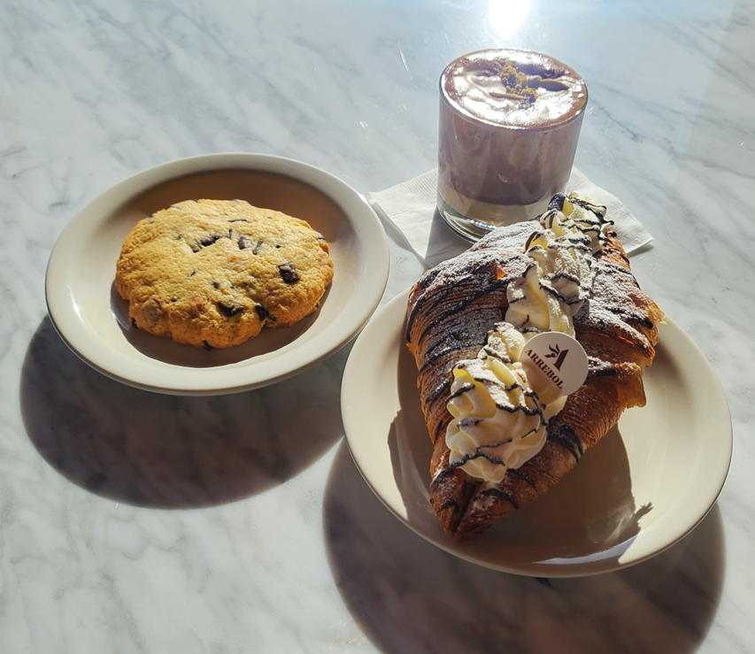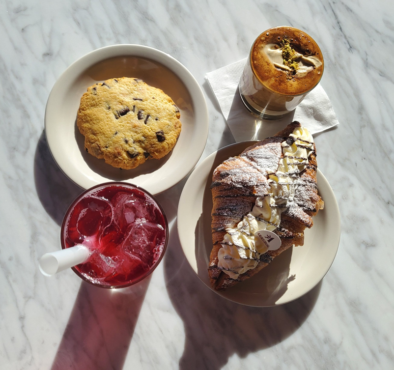 저희가 주문한 음료와 베이커리들입니다. ㅎㅎ 아레볼에이드, 피스타치오크림라떼, 쿠키와 크로와상!