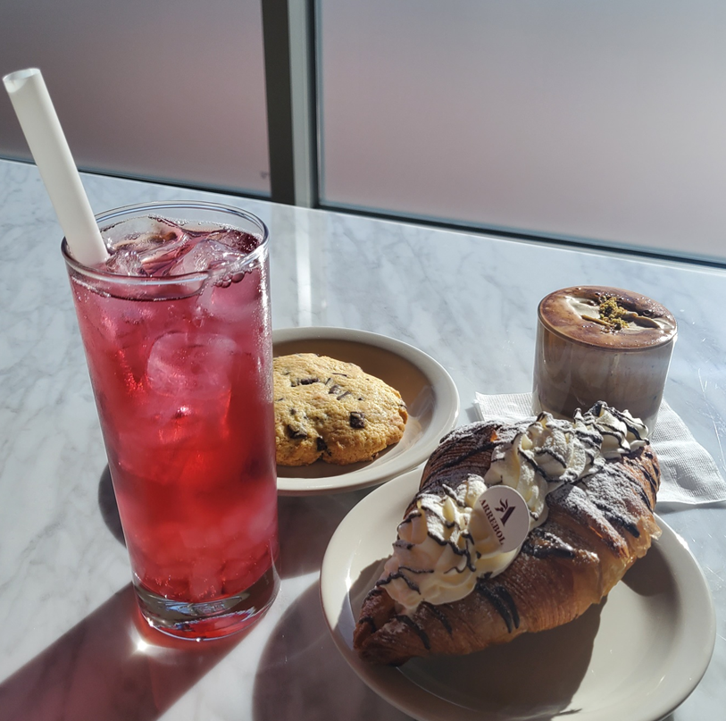 저희가 주문한 음료와 베이커리들입니다. ㅎㅎ 아레볼에이드, 피스타치오크림라떼, 쿠키와 크로와상!