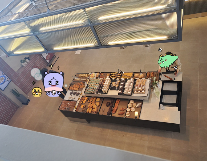 매장에 입장하면 채광과 조명이 공간을 환하게 밝혀줍니다.ㅎㅎ 그리고 빵들이 반갑게 맞이해주고 있지요.ㅎㅎ 저희는 먼저 카페를 둘러봤습니다.ㅎㅎ 4층까지 다 사용하고, 뿐만 아니라 루프탑까지 있어서 날씨 좋을 때는 루프탑 경쟁이 꽤 있을 것 같았어요.ㅎㅎ