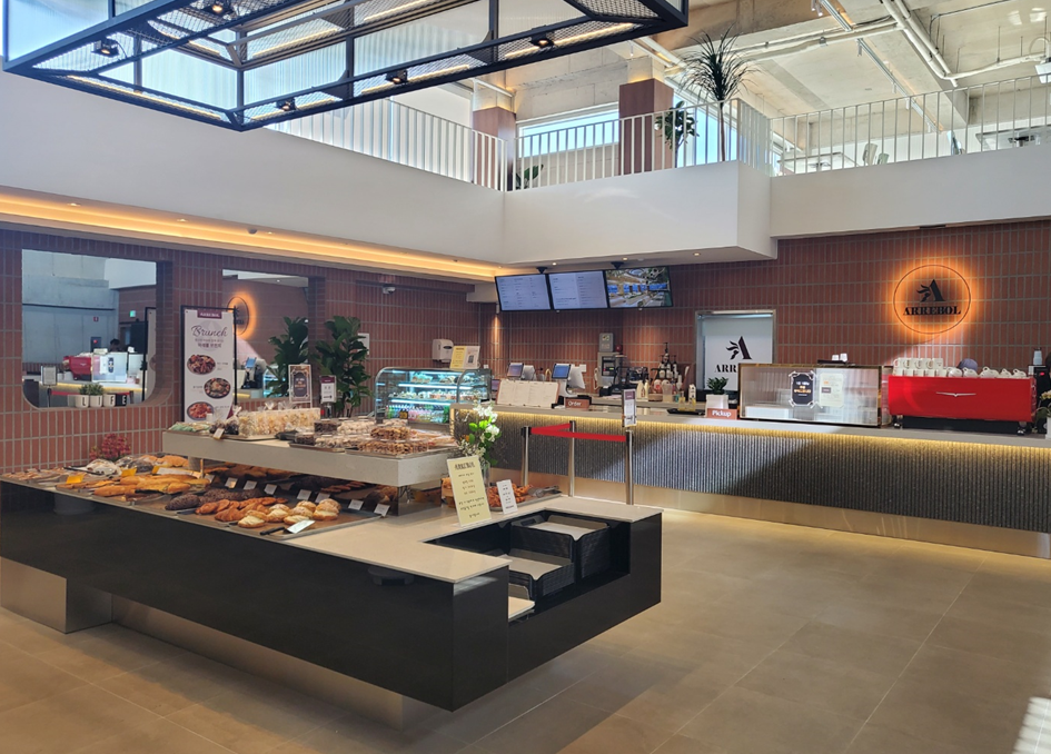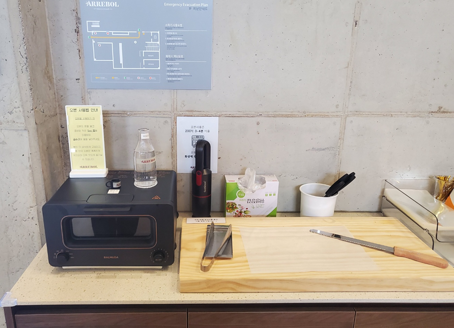 요즘 대부분의 카페가 그렇듯 아레볼에도 셀프바가 깔끔하게 구비되어 있었어요! 엘리베이터 앞에는 셀프바가 있어서 빵을 데우거나, 필요한 식기를 챙기시면 될 것 같아요.ㅎㅎ