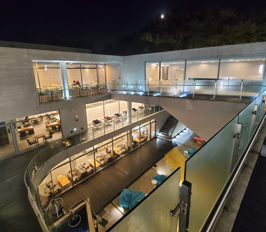 1층은 카운터, 화장실, 셀프바와 함께 실내외 좌석이 있습니다. 그리고 2층에도 실내외 자석과 전시 공간도 있고, 장애인 화장실이 있어요. 3층도 실내외 좌석과 루프탑, 전시공간, 화장실이 있어요. 분기별로 다른 작가의 작품을 무료로 관람할 수 있습니다.