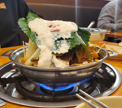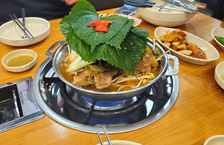 그리고 콩비지가 없는 감자탕이 그대로 나옵니다. ㅎㅎ 깻잎이 어마무시하게 크죠.ㅎㅎ