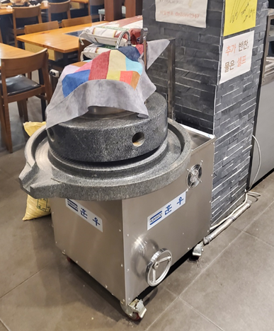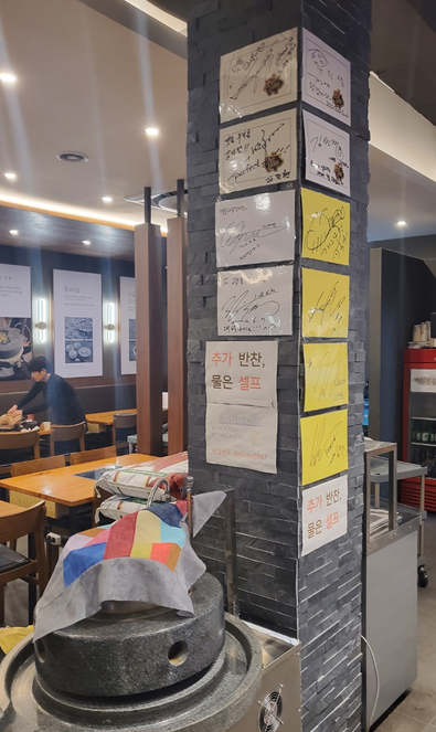 티비에도 소개되었던 가게라 그런지 유명인들의 사인도 붙어 있었어요.ㅎㅎ 맛있는 녀석들 1기가 다녀왔었으니 맛은 보장하겠죠?ㅎㅎ 기둥 앞에 맷돌이 있는데 직접 갈아 요리하시는 것 같더라고요!