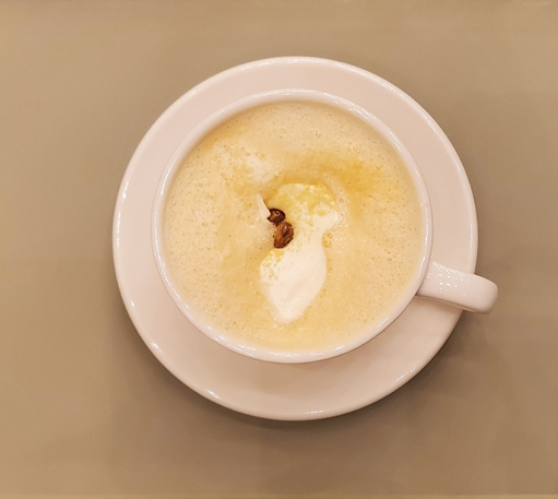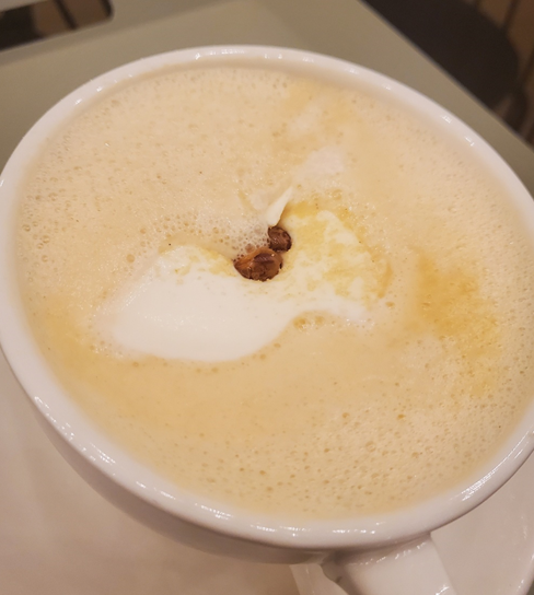 진동벨이 울려서 음료를 찾아왔습니다. ㅎㅎ 장단콩은 민통선에서 나오는 청정 자연의 콩이라 하더라고요! 몽글하게 올라온 거품 위로 볶은 콩 두 알이 올라와 있습니다. ㅎㅎ 두유 같이 고소하면서 밀도가 높아 묵직한 맛이 강하더라고요! 고소하고 부드러워 추운 날에 마시기 아주 좋았습니다.ㅎ 콩으로 만든 라떼라 그런지 포만감도 줘서 배가 든든했습니다!