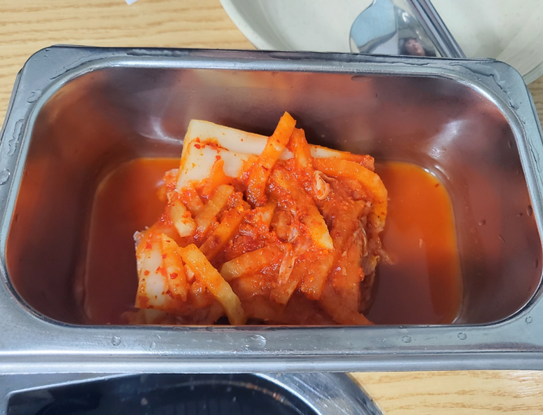 밑반찬은 동치미와 김치가 통으로 나오는데 김치는 적절한 양으로 덜어 드시면 됩니다. ㅎㅎ 동치미는 저희 외가 짠지 맛이 나서 반갑더라고요!ㅎㅎ 짭짜름하니 흰쌀밥과 어울리는 반찬이었습니다.ㅎㅎ