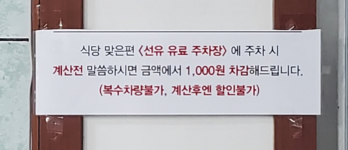 참, 주차는 삼거리에 있는 선유 유료 주차장에 주차하시고 계산 전에 말씀해주셔야 1,000원 차감입니다! 저는 식당 바로 앞에 주차 공간이 있어 유료 주차는 하지 않았으나, 낮이나 주말에는 유료 주차장을 이용하셔야 좋을 것 같아요!