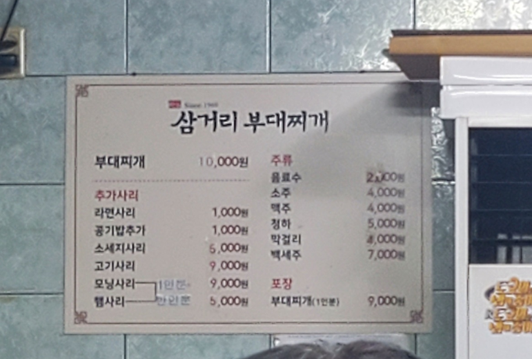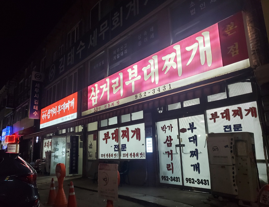 바로 삼거리 부대찌개입니다! 정말 삼거리에 있어서 삼거리 부대찌개더라고요.ㅎㅎ 본점 바로 옆에 분점 1호점이 있는데 저는 조금 늦은 시간에 가서 본점으로 들어갈 수 있었습니다. ㅎㅎ 이야기 듣기로는 웨이팅이 정말 길다고 했는데 늦은 시간이라 그런지 바로 입장했으나! 저희도 바로 나오는 테이블이 있어 운 좋게 빨리 들어갈 수 있었어요. ㅎㅎㅎ 웨이팅이 있으니 주말이나 점심때 방문하시는 분들은 식당으로 들어가 바로 대기표를 받으세요!