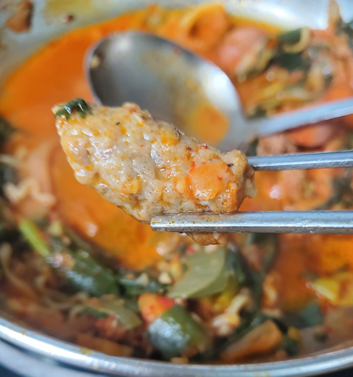 햄이나 소시지도 저렴한 일반 햄, 소시지 맛이 아니라 고기맛이 진하고, 쑥갓이 많이 들어가서 쑥갓 향과 잘 어울려 묵은내 같은 건 나지 않아서 먹기 편했어요! 국물도 진해서 라면 사리에 흡수되어 줄어드는 국물이 아깝다 생각이 들었습니다. ㅎㅎ