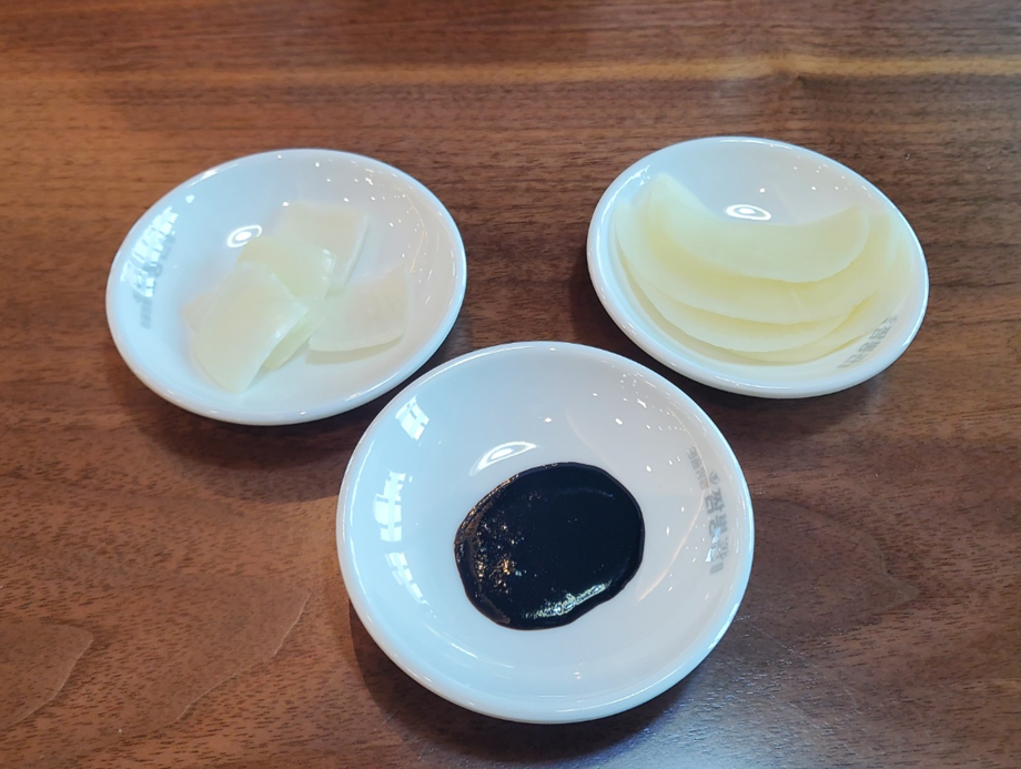 자리에서 주문을 하면 단무지와 양파를 가져다주십니다.ㅎㅎ 하얀 단무지가 나와서 당황했는데, 일반 단무지와 같은 맛이었습니다. ㅎㅎ