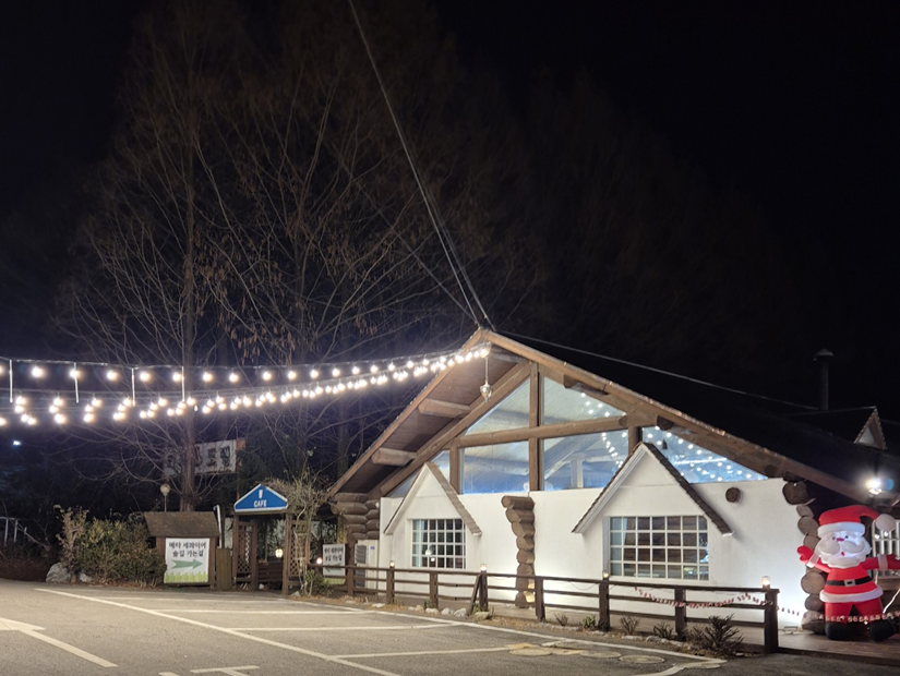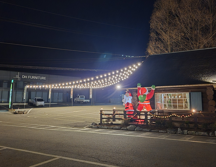 카페 앞 정말 넓은 주차공간이 준비되어 있습니다. 대형 차량도 수용 가능할 정도로 넓었어요.ㅎㅎ 그릭 카페 뒤쪽으로 메타세콰이어 숲길이 있는데 너무 추워서 가지 못했지만 지나가면서 봤는데 정말 멋지더라고요!! 날이 좀 풀리거나 눈 오면 꼭 한번 가 보세요.ㅎㅎ 크리스마스가 다가오고 있어 산타도 달려 있습니다.ㅎ
