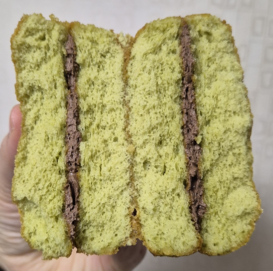 반을 갈라 보면 은은한 초록색 베이스의 빵이 나와요.ㅎㅎ 빵 두께가 꽤나 두껍습니다. 그리고 감초 역할이 되어주는 초코 크림이 가운데 샌드되어 있어요. 크림의 양이 생각보다 많습니다.ㅎㅎ 빵 역시 폭신하니 부드러웠어요.