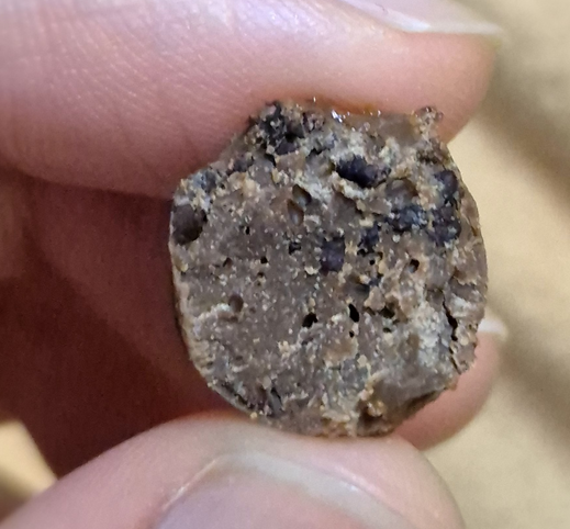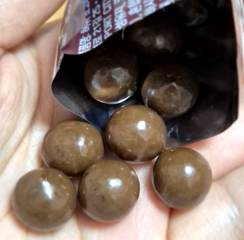엄마는 외계인 같은 초코볼을 생각했는데 크런치 과자는 없는 초코볼이에요.ㅎㅎ 초코 덩어리 안에 쿠키 분태가 들어가 있어요. 쿠키를 기대하고 먹는다면 조금은 아쉬울 수 있을 것 같습니다. 저는 쿠키를 좋아해서 조금 아쉬웠어요.ㅎㅎ