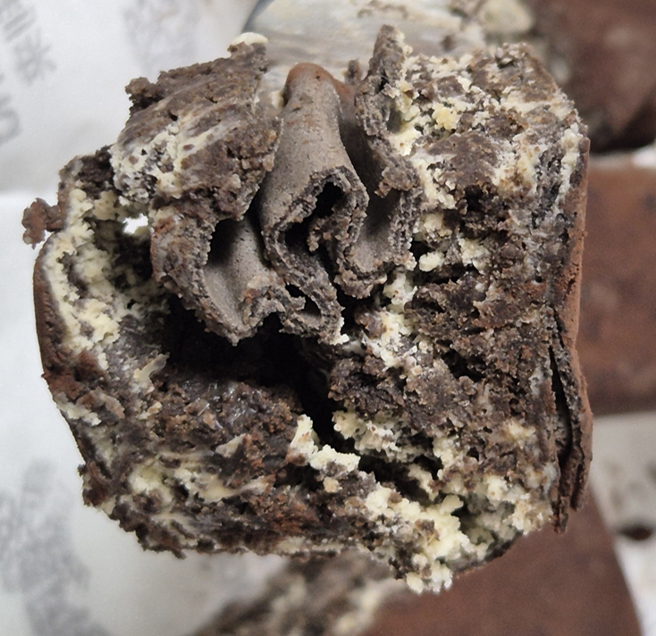 조각을 낼 수록 결이 살아 있는 걸 볼 수 있습니다.ㅎㅎ 저는 냉장으로 보관한 상태로 먹어서 촉촉한 빵처럼 먹었어요.ㅎㅎ 크림이 듬뿍 있어 조금은 느끼했지만 그래도 오레오 맛이 강해서 오레오 맛으로 먹기 좋았습니다.ㅎㅎ 크레페는 녹아서 그런지 크림이랑 같이 먹으니 정말 쭌덕하더라고요.ㅎㅎ