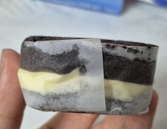 포장을 뜯으면 유산지로 싸여 있는데 살살 벗기면 케이크, 크림, 케이크, 쿠키로 샌드가 되어 있습니다.ㅎㅎ 케이크 부분은 정말 폭신폭신해서 조심해야겠더라고요!