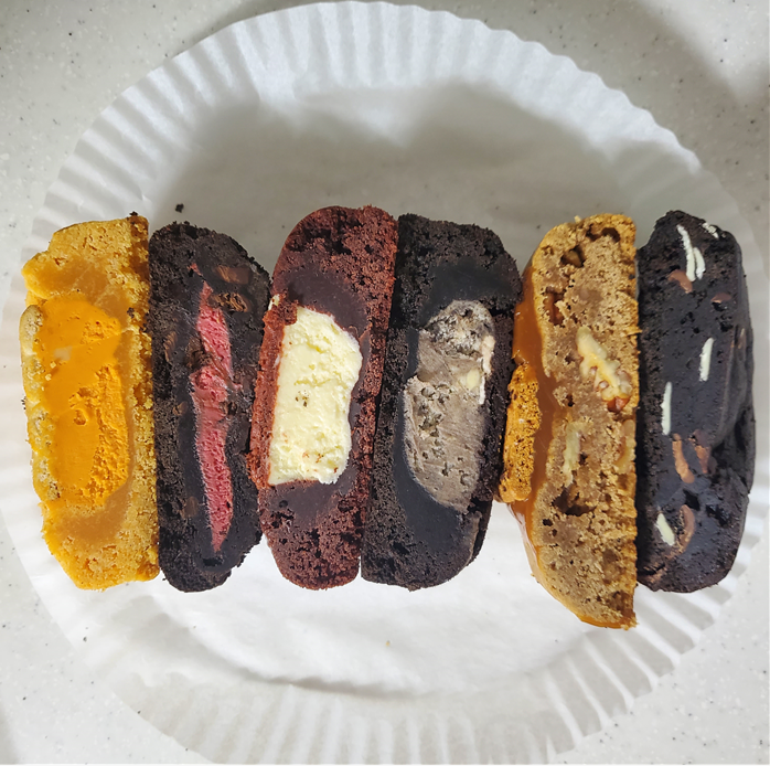 순서대로 황치즈, 레드벨벳, 트리플 카카오, 오레오 크림치즈, 솔티드 로투스, 순경이의 실수(돼지바)입니다. ㅎ 사진만 봐도 코가 달달한 것 같네요!ㅎㅎ (사실 진짜 옆에 간식이 있어요..ㅎㅎㅎ)