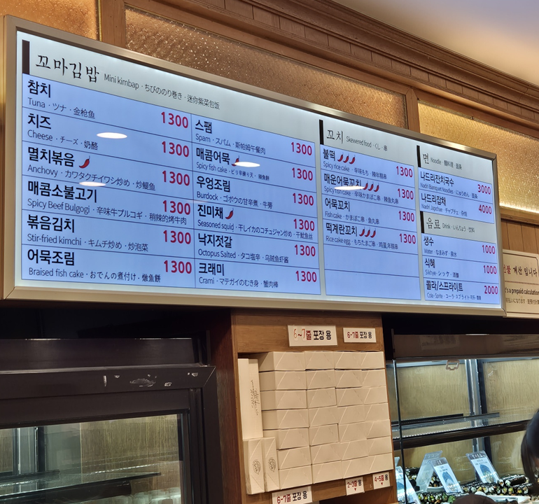 들어가면 바로 정면에 김밥이 있는 쇼케이스가 보입니다. 메뉴에 있는 것들이 모두 쇼케이스에 있어요. 포장도 가능한데 2줄 이상부터 가능합니다. 내가 필요한 김밥의 수를 예상하시고 옆에 박스에 담으시면 돼요. 모두 1,300원씩입니다. 와, 김밥 한 줄이 1,000원이던 시절이 있었는데 꼬마 김밥이 한 줄에 1,300원이나 되는 시대가 됐네요.ㅠㅎㅎ