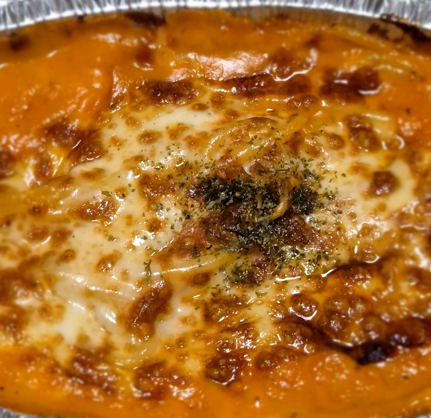 크림이 들어가 토마토 파스타보다 더 뽀얀 로제 파스타입니다. 오븐에서 구워져 나온 치즈가 노릇하게 올라가 있습니다.