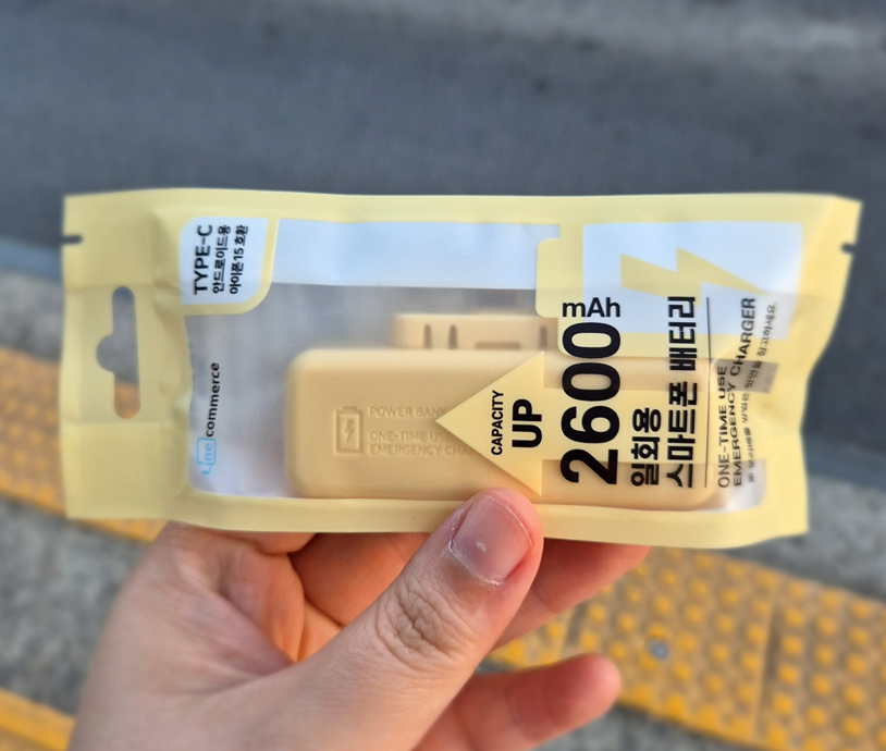 CU 편의점에서 보조 배터리를 구매하시려면 차라리 1,900원을 더 해서 다회용을 구매하시는 걸 추천드려요.ㅎㅎ 일회용은 정말 1%가 남아서 어쩔 수 없을 때 아주 잠시 연명하는 정도로만 사용하면 될 것 같습니다.