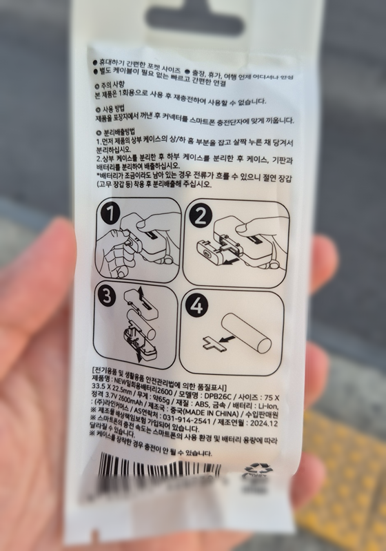 금액은 5,000원으로 다회용(6,900원)과 1,900원 차이가 납니다. 2600mAh라고 하는데 두 번 구매하면서 한 번도 2600까지 제대로 사용해 보지 못한 것 같습니다.