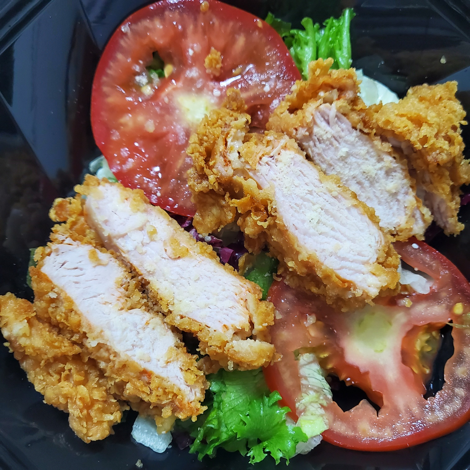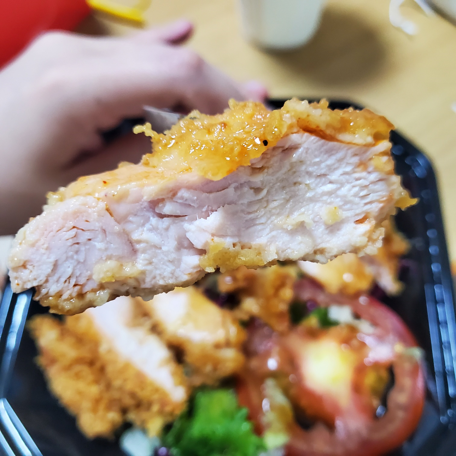 비주얼은 뭐 거의 돈까스인가 싶은 모습이죠!ㅎㅎ 두툼한 닭가슴살 튀김이 채소들 위에 곱게 올라가 있습니다. ㅎㅎ
