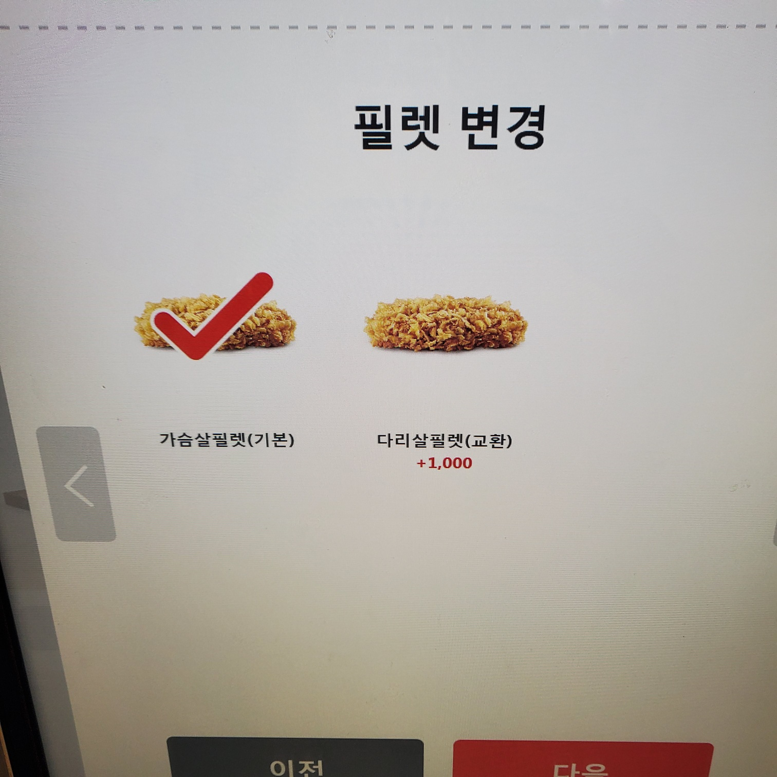 토핑이라 할 수 있죠?ㅎㅎ 필렛은 기본으로 닭가슴살이 나오는데, 1,000원을 추가하면 다리살로 변경이 가능해요!ㅎㅎ 저는 오리지널로 도전하는 것을 좋아하기 때문에, 그리고 충분히 튀겨 나오는 닭가슴살이기에 맛이 없을 리가 없어서 기본으로 주문했습니다. ㅎㅎ