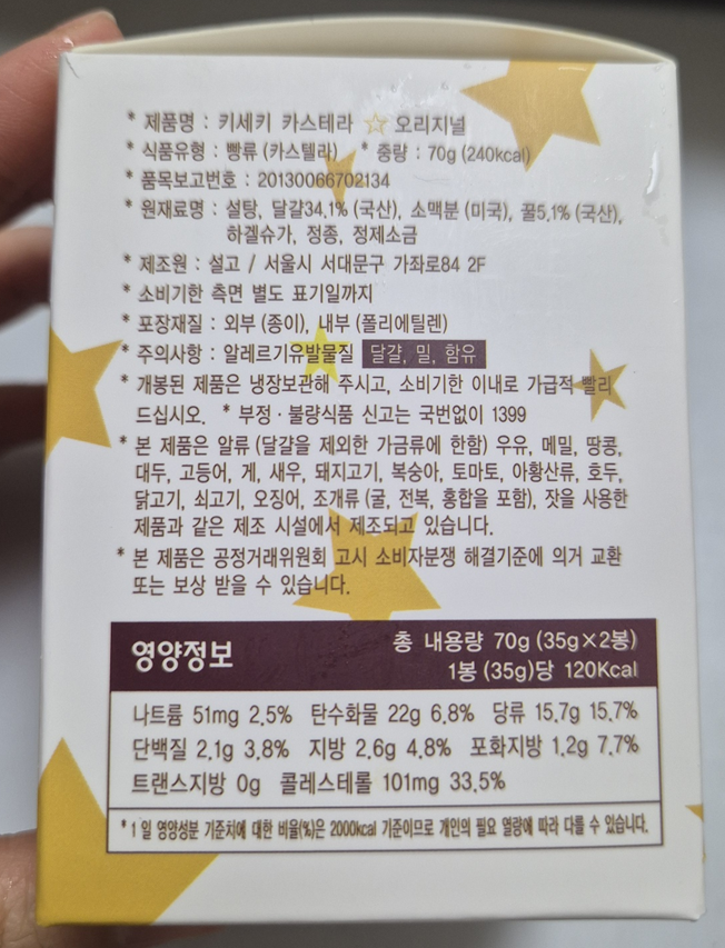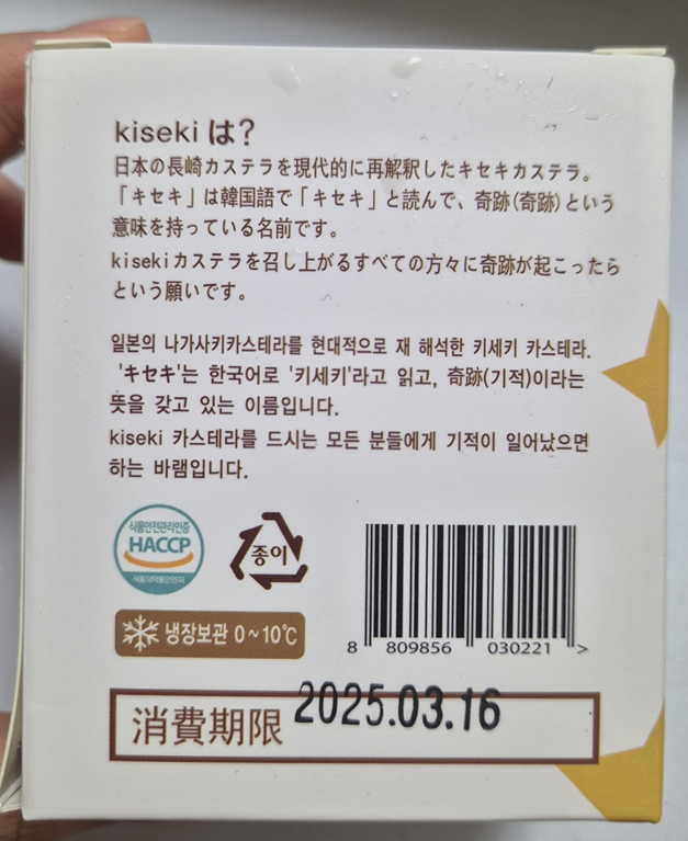 상자 안에 2 봉지가 들어 있는데 한 봉지당 120Kcal네요!ㅎㅎ 키세키 카스테라는 카스테라로 유명한 나가사키 카스테라를 현대적으로 재해석해서 만들어 낸 카스테라라고 해요.ㅎㅎ 기적이라는 뜻이 있는 키세키를 사용해서 키세키 카스테라를 먹는 모든 이들에게 기적이 일어나길 바란다는 의미를 담았다고 해요.ㅎㅎ