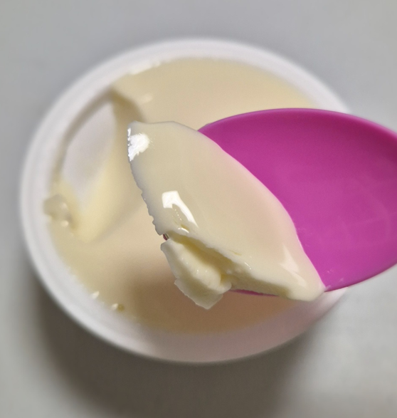 푸딩의 달달한 향이 나는 것보다는 새큼한 향이 많이 났습니다.ㅎㅎ 한 스푼 떠 내면 일반 푸딩보다는 그릭요거트의 질감과 더 비슷한 것 같아요.ㅎㅎ