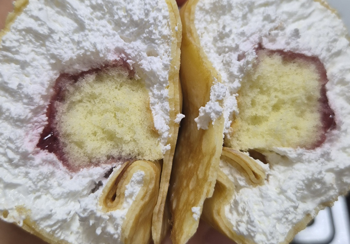 gs25 수건 케이크 안에는 생크림과 함께 카스텔라와 같은 시트가 들어가 있어요.ㅎ 마오쥔젤을 먼저 먹어 봤기 때문에 낚였다는 생각이 들기도 했는데 오히려 빵이 있어서 그런지 크림만 먹는 것보다 덜 느끼하더라고요.ㅎㅎ 하지만 크레이프 케이크를 좋아하신다면 아쉬워하실 것 같습니다. ㅎㅎ