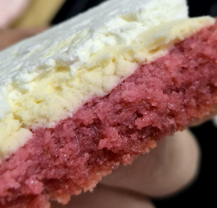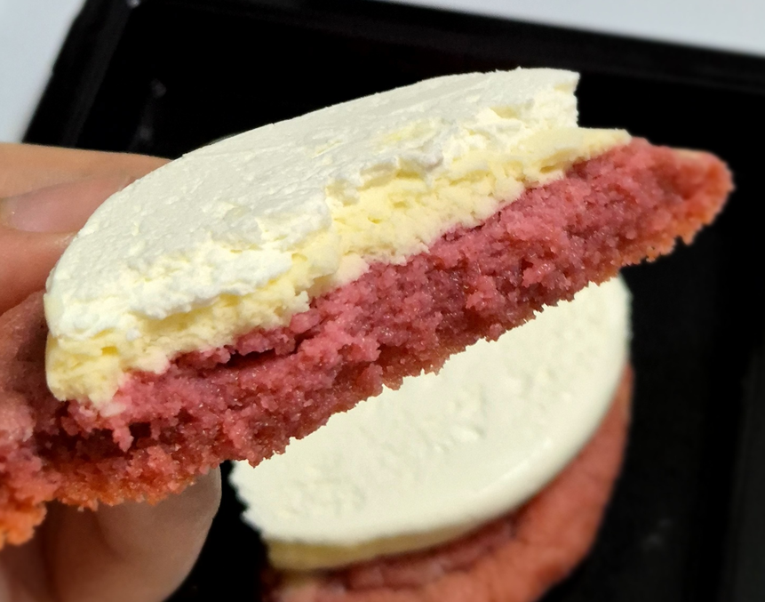 색이 붉어서 그런지 살짝 레드벨벳 케이크의 향이 나는 듯했습니다. 핑크 크럼블 쿠키의 크림은 두 가지 크림이 쌓여 있는데 슈가 크럼블 쿠키보다는 덜 느끼하고 살짝 치즈맛이 더 났던 것 같습니다.