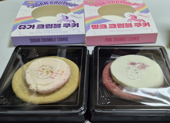 편의점에 갔을 때 신기한 신제품이 있어서 구매해 봤어요. 슈가 크럼블 쿠키와 핑크 크럼블 쿠키입니다. 신기해서 먹어 봤는데 이게 도대체 뭔가 싶은 마음으로 후기를 가져왔어요.ㅎㅎ