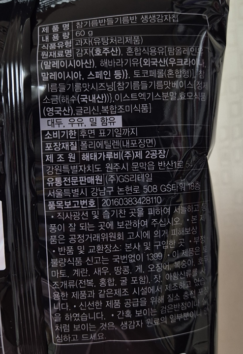 말씀드렸듯이 gs25의 유어스 제품이라 지에스에서만 구입이 가능합니다. 참기름 하나만 있어도 고소한데 들기름까지 함께해 고소한 감자칩이에요.