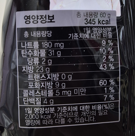 나트륨(mg/%) 탄수화물(g/%) 당류(g/%) 지방 (g/%) 트랜스지방(g) 포화지방 (g/%) 콜레스테롤 (mg/%) 단백질 (g/%) 180/9 31/10 2/2 23/43 0 9/60 5↓/1 4