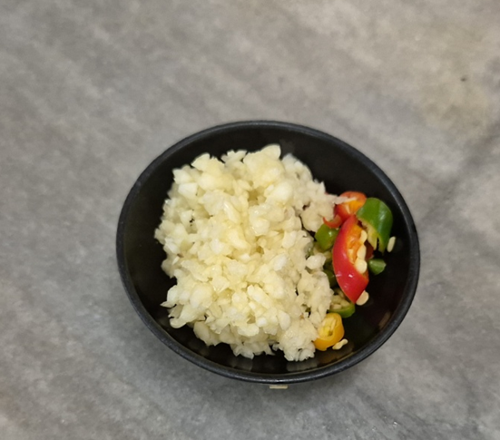 그리고 다진 마늘과 고추를 세척한 종지에 취향껏 담아 구비 되어 있는 양념과 섞어 소스를 만듭니다.ㅎㅎ 와 이거 정말 깔끔하고 입안이 상쾌해져서 정말 맛있더라고요! 역시 한국인은 마늘을 많이 넣어야 하죠.ㅎㅎ